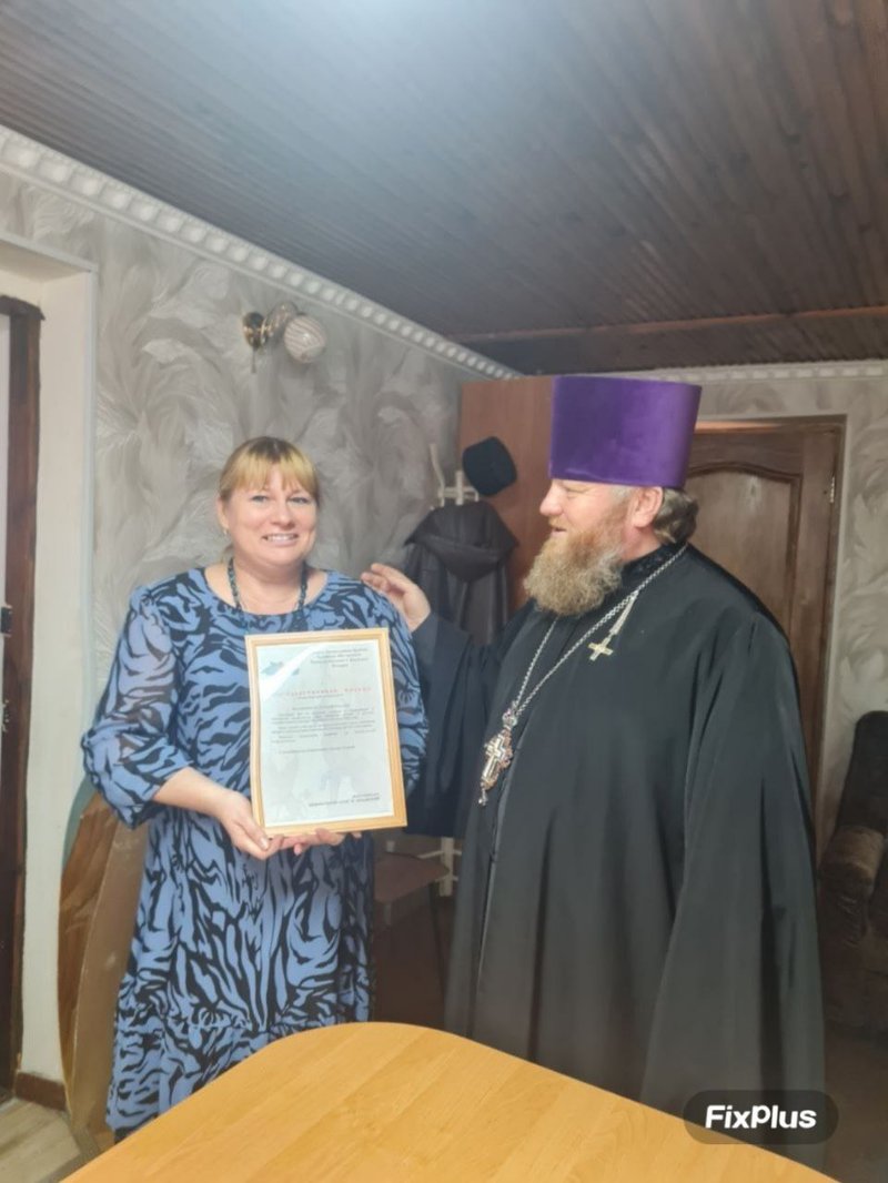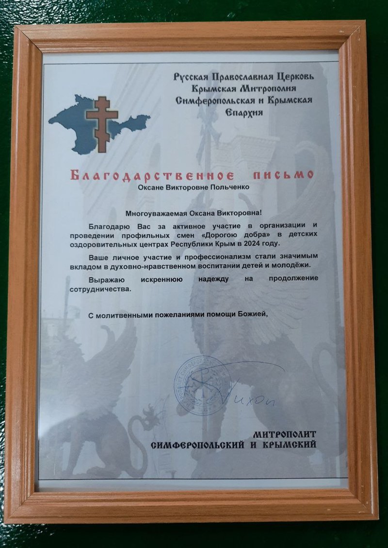 09 ноября 2025 года, преподавателю воскресной школы Свято-Рождественского храма Польченко Оксане Викторовне (в крещении Ксение) вручили благодарственное письмо от Митрополита Симферопольского и Крымского Тихона за труды Божии, профессионализм, активное участие и духовно-нравственное воспитание детей и молодёжи!