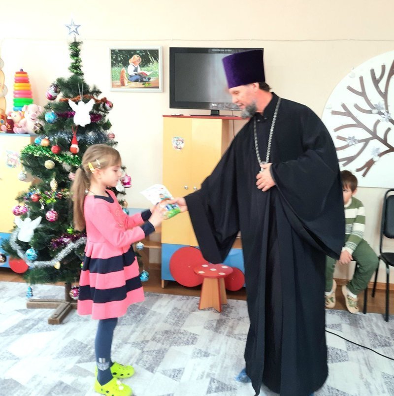 Всем детям священник подарил сладкие подарки от Свято-Рождественского прихода п. Первомайского, а дети подарили Батюшке новогоднюю игрушку, которую сделали своими руками.